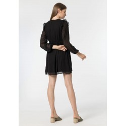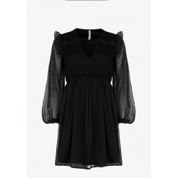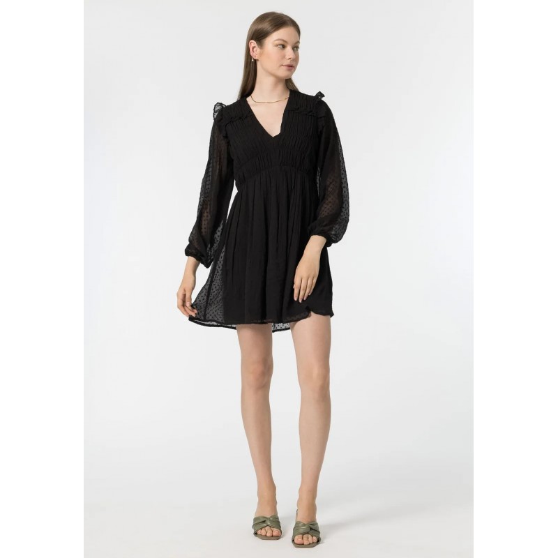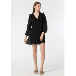 Vestido para mujer de gasa con detalle de volantes en sus hombros, escote en forma de pico, elástico en cintura y en sus mangas largas.